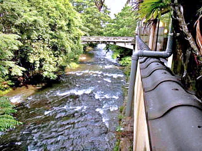 グリーンロードを横切り、温泉街に入ったらコース案内標識に従ってコースへ。
