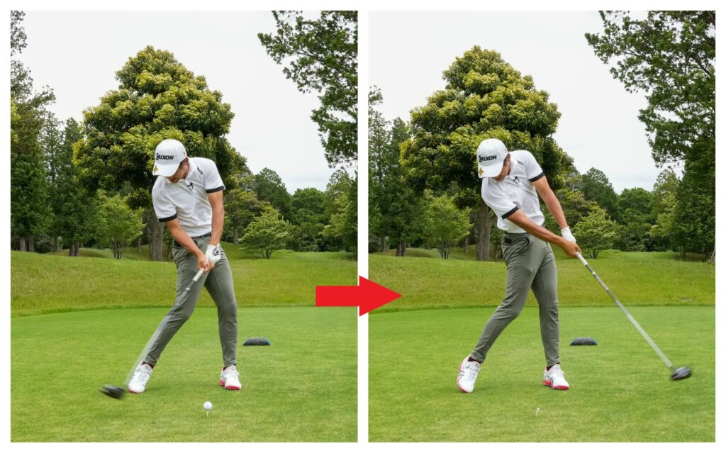 普段のゴルフでは左に振る意識はしませんが、飛ばすためには反対の右に振る意識も重要になってくるんですよね。