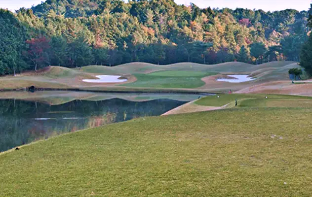 15番ロングは北摂の山並みを借景に池を配していて、戦略的でプレーヤーの征服欲を高めています。