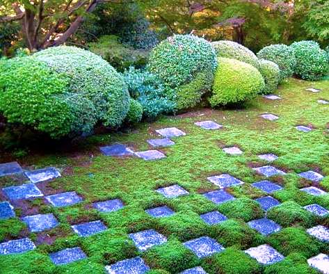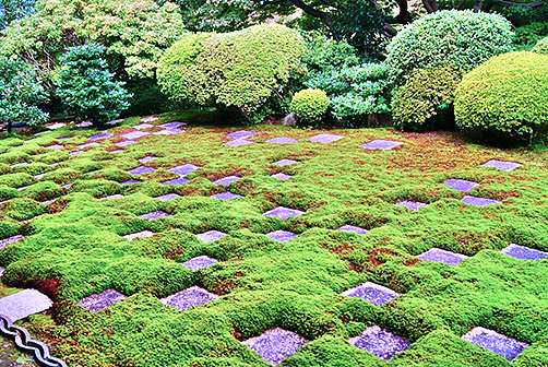 北庭も苔と板石で作られた小市松模様が見事な庭園。板石には勅使門(ちょくしもん:勅使[勅旨を伝えるために派遣される使者]の通行に使われる門)から、方丈に向けて敷きつめられていた切石が再利用されています。北庭の始まり部分は西庭の大市松から繋がっており、だんだん板石部分が少なくなりながら東北方向の谷に消えていくという表現方法です。作庭当時は、白河砂と苔の仕切り線が曲線で表現されていたり、庭園では珍しいぼかしを表現するために白河砂の上に板石を置いたりといった重森三玲独特の表現を垣間見ることができましたが、苔の繁茂(はんも:草木などが盛んに生い茂ること)により白河砂部分は完全に苔で覆われています。