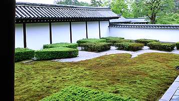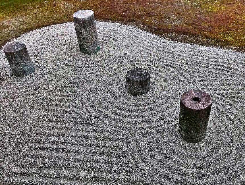 東庭は北斗七星・南庭は京都五山・西庭は大市松・北庭は小市松とそれぞれテーマが異なり、苔・白砂・岩の絶妙な配置と洗練された美しさが多くの人を魅了する庭園となっています。