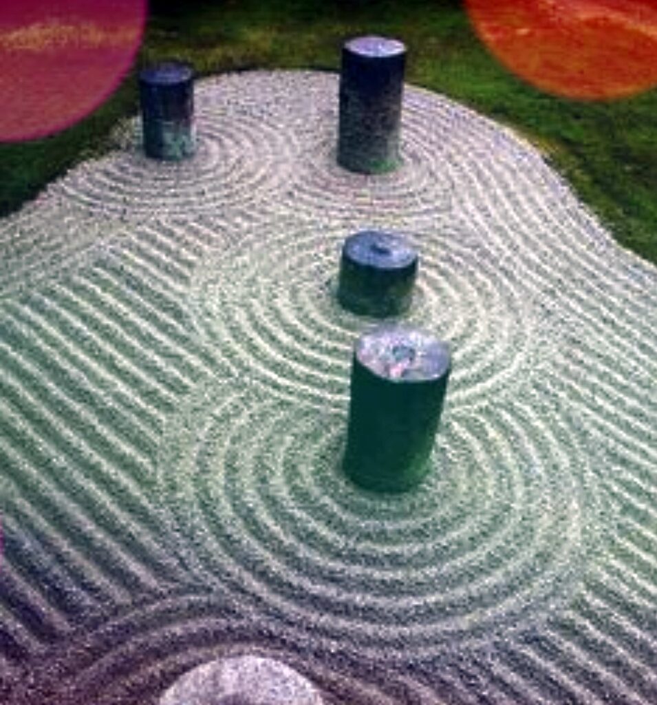 しかし、重森三玲はこれを逆手に取り、鎌倉時代の庭園をベースにモダンな枯山水(かれさんすい:水を用いず岩や砂などで山水を表現した日本庭園様式)を完成させました。