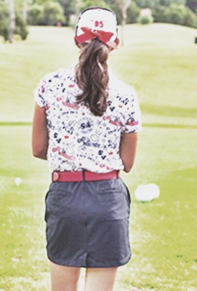 もしくは、バックスイングのトップで背中をターゲットに向ける・・でもいいです。(肩を90度回す、もしくは、背中がターゲットを向く形が一つの目安)