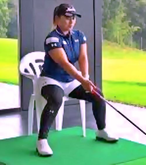 椅子に座って肩にクラブをあてがい足を軽く肩幅くらいに開きます。