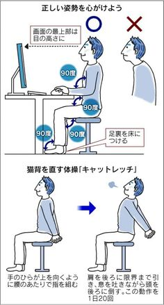 特にデスクワーク(座った状態でのお仕事)の方は椅子や机、パソコンの位置や高さ、角度といったちょっとしたことで姿勢が悪くなってしまうので細心の注意が必要です。