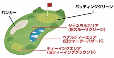 バンカーとパッティング グリーンにはエリアという言葉が使われていないが、バンカーもパッティング グリーンも5つあるエリアの1つだと覚えておいて頂きたいです。