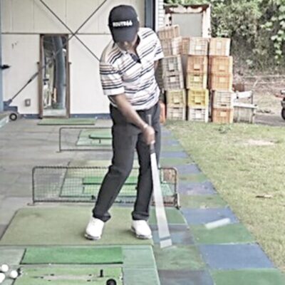 後は右足のかかとが着いたらバックスイング、左足のかかとが着いたらダウンスイングの足踏みしながらクラブヘッドを「振って振って、振りまくる」ことです。