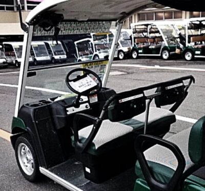 「加茂カントリークラブ」のゴルフ場に着いたらポーターさんがいたはりませんのでクラブを自分で車から降ろし、スタート室近くのキャリーバック置き場に自分で持って行ってください。