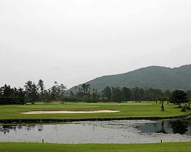 グリーンを池がぐるりと囲んでいます。