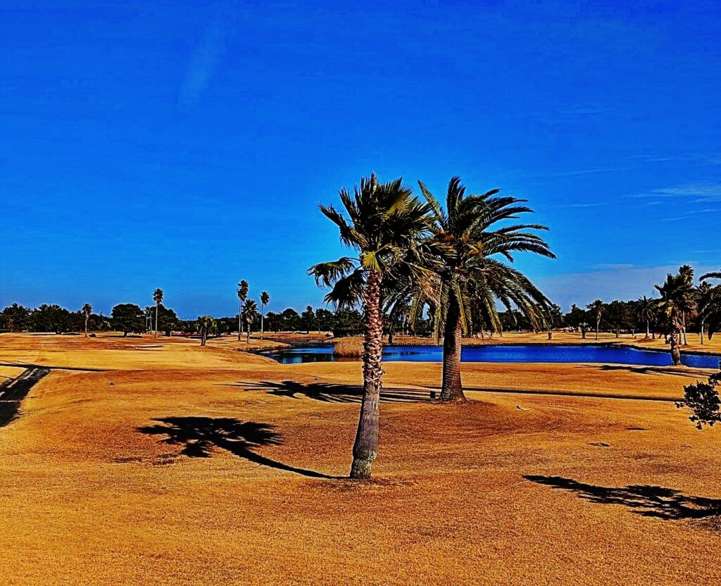 多くのヤシの木が植えられ、海外のようなリゾート感あふれる景観が楽しめます。ヤシの木や松林が配され、要所には池も配置されており、単調にならず戦略性の高いプレーが楽しめます。