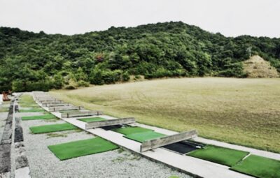 (Aクラスの競技以外は左のサブグリーンでプレー) 軽い二段グリーン。